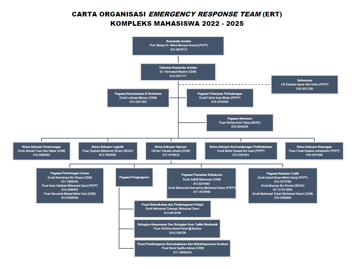 The Emergency Response Team (ERT) at the Student Complex (KM) / Academic Complex A (KAA) was established in 2016 due to the awareness of the fundamental importance of emergency response in the workplace.